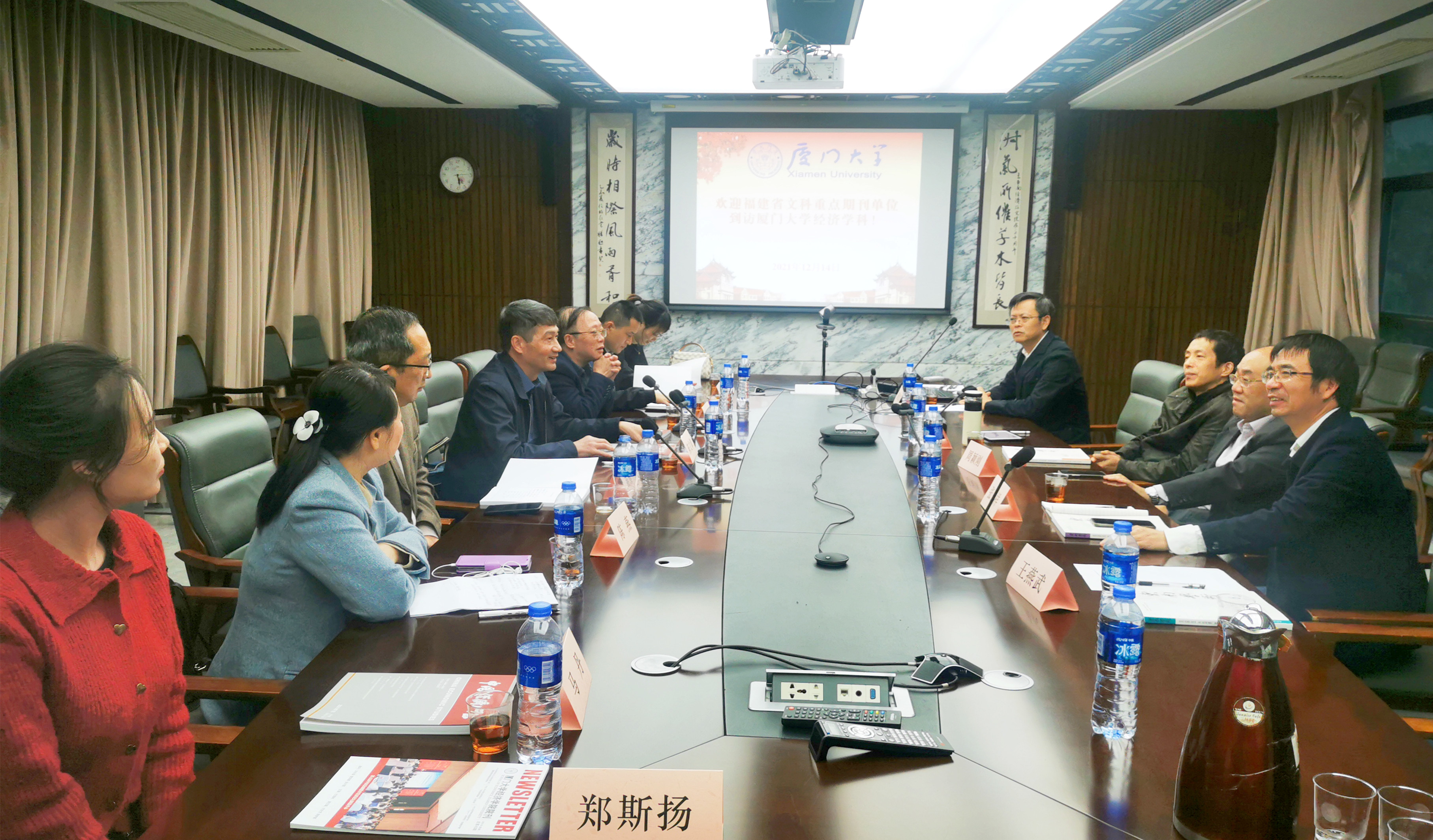 12月14日下午,福建省社科联副主席、《东南学术》杂志社社长陈文章,《东南学术》杂志社执行总编辑杨健民,《亚太经济》杂志社副主编黄启才,《福建论坛》杂志社副研究员陈燕,《福州大学学报》主编苗健青等省内文科重点期刊单位的负责人一行7人到访厦门大学宏观经济研究中心,并与中心教师开展座谈交流。厦门大学王亚南经济研究院副院长、宏观经济研究中心副主任周颖刚教授,厦门大学宏观经济研究中心副主任林致远教授,厦门大学经济学院经济学系代系主任、《中国经济问题》常务副主编张兴祥教授等参与本次座谈。