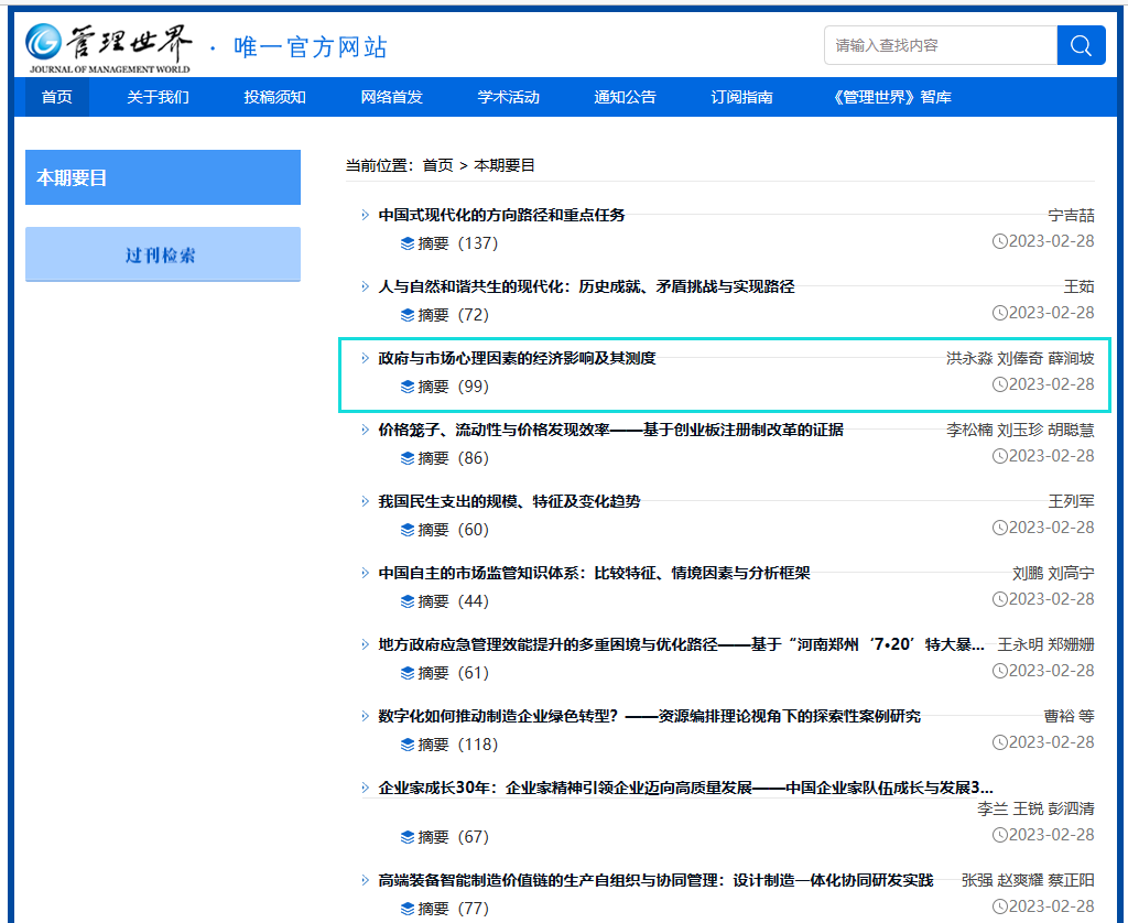 近日,《管理世界》2023年第3期刊发厦门大学宏观经济研究中心学者洪永淼教授和薛涧坡教授,与邹至庄经济研究院首届博士毕业生刘俸奇助理研究员的合作论文,题为“政府与市场心理因素的经济影响及其测度”。