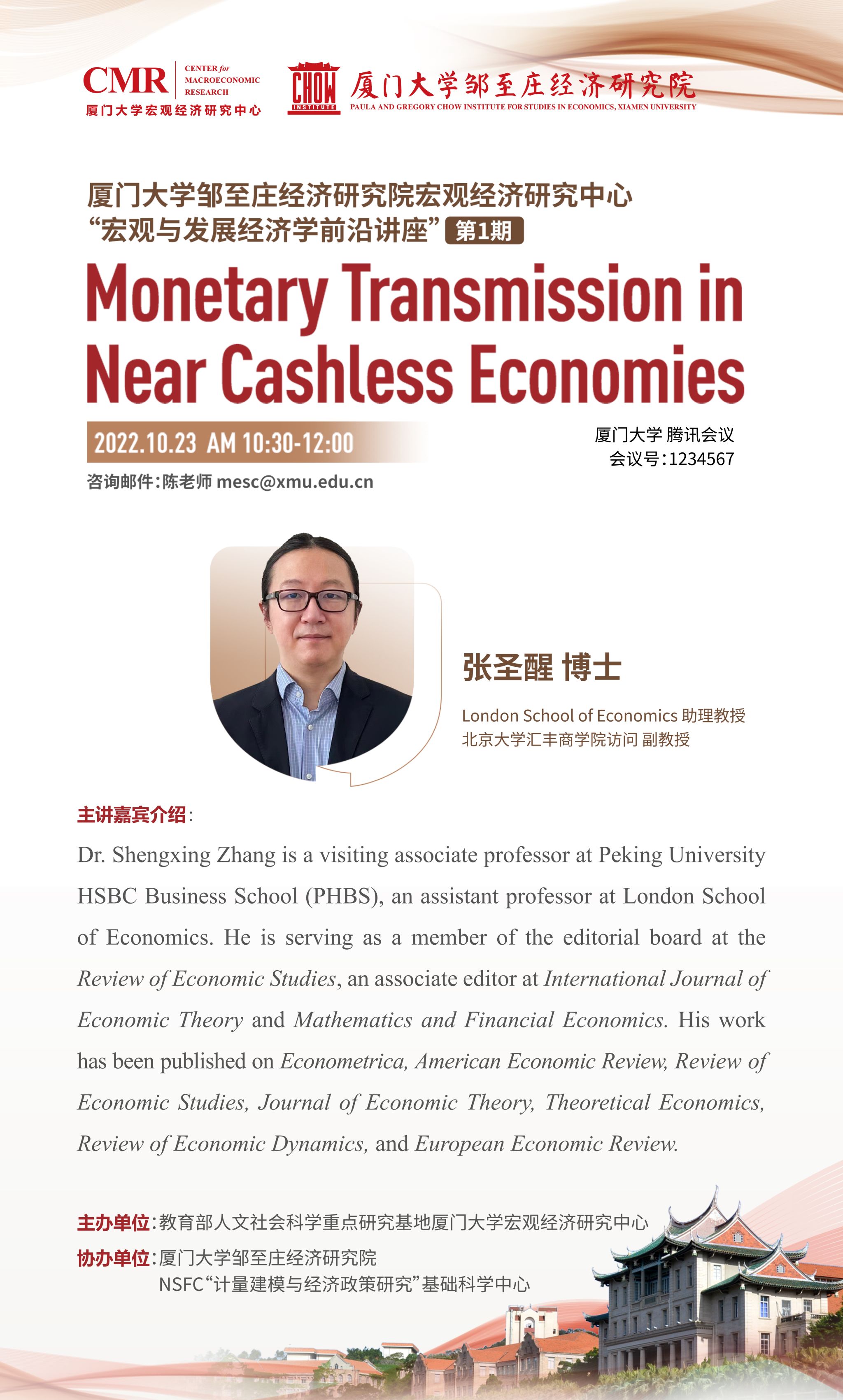 2022年10月23日,厦门大学邹至庄经济研究院宏观经济研究中心“宏观与发展经济学前沿讲座”系列第1期正式开讲。讲座邀请到伦敦政治经济学院助理教授、北大汇丰商学院访问副教授张圣醒博士做题为“Monetary Transmission in Near Cashless Economies“的学术报告。