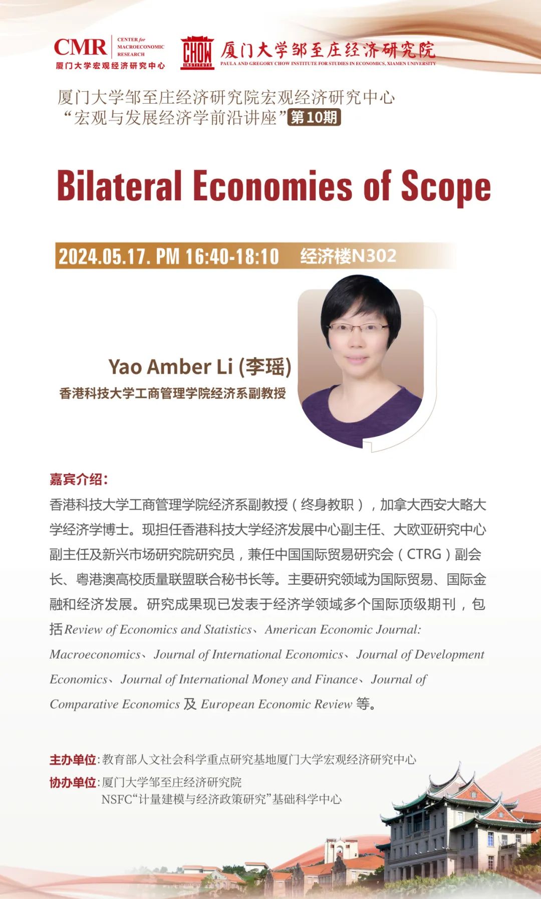 2024年5月17日下午,经济楼N302会议室,来自香港科技大学的李瑶教授(Yao Amber Li)莅临厦门大学经济学科,并带来了一场题为“Bilateral Economies of Scope”的学术讲座。本讲座是厦门大学邹至庄经济研究院宏观经济研究中心“宏观与发展经济学前沿讲座”第10期,由厦门大学邹至庄经济研究院副院长薛涧坡教授主持。