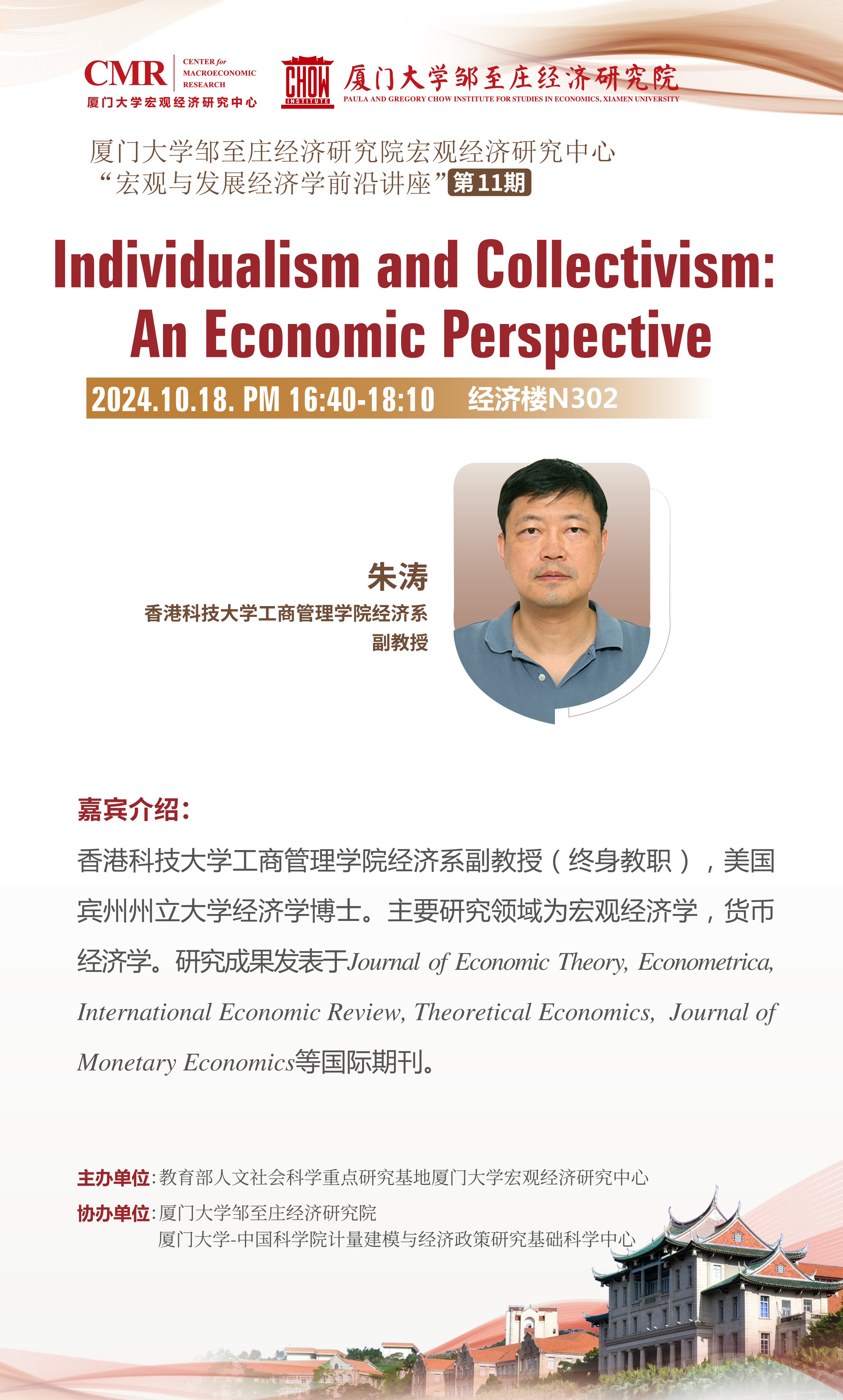 2024年10月18日下午,经济楼N302会议室,来自香港科技大学工商管理学院的朱涛副教授莅临厦门大学经济学科,并带来了一场题为“Individualism and Collectivism: An Economic Perspective”的学术讲座。