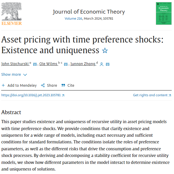 近日,邹至庄经济研究院宏观经济研究中心与王亚南经济研究院(WISE)双聘助理教授张钧南与澳大利亚国立大学John Stachurski教授,汉堡大学、蒂尔堡大学Ole Wilms副教授合作完成的论文Asset pricing with time preference shocks: Existence and uniqueness发表在经济理论国际顶级期刊Journal of Economic Theory 2024216卷。